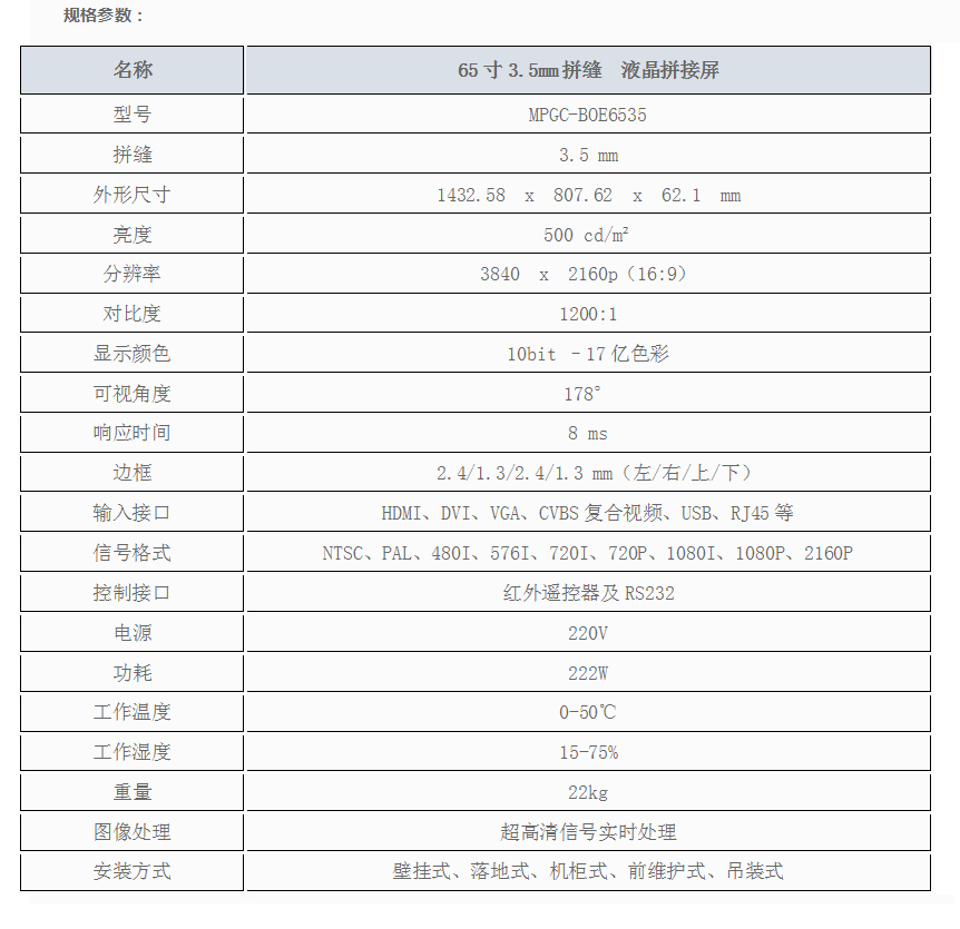 京东方65寸3.5mm拼缝拼接屏,应用东方独有的ADSDS(高级超维场转换技术),按压屏幕无水波纹,无屏闪,画质更清晰,更稳定,更高的光透过率和色彩度;具备更高的液晶分子响应速度,没有拖尾和重影现象,可以更好的表现运动画面。